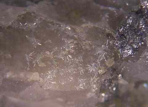 Field of view: 5 mm. Parasymplesite associated with löllingite. The radial groups of acicular pale blue crystals with a vitreous luster are parasymplesite. The massive silver-white part with a metallic luster is löllingite. The massive transparent white basement is gangue quartz.