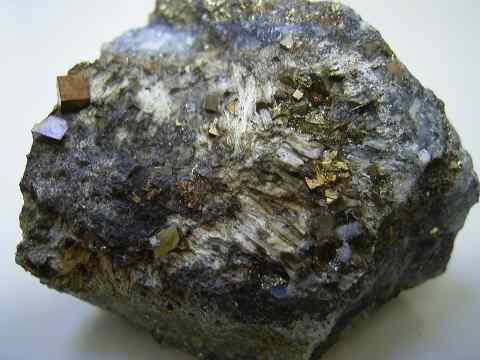 Field of view: 50 mm. Tremolite associated with pyrite. The columnar groups of white fibers are tremolite. The yellow cubes are pyrite. The massive white to gray host is aggregate of fine calcite crystals.
