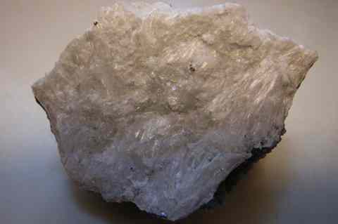 幅50mm。珪灰石の集合。 ガラス光沢を示す白色繊維状結晶の扇状集合が珪灰石。