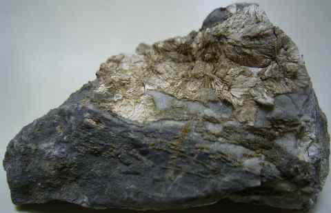 Width: 50 mm. Wollastonite associated with calcite. The radial groups of white fibers at the top is wollastonite. The surrounding massive white to dark gray parts are aggregate of granular calcite crystals. The dark gray calcite at the bottom exhibits bedding planes, the original sedimentary structure. Note that wollastonite is embossed as it is stronger than calcite to weathering.